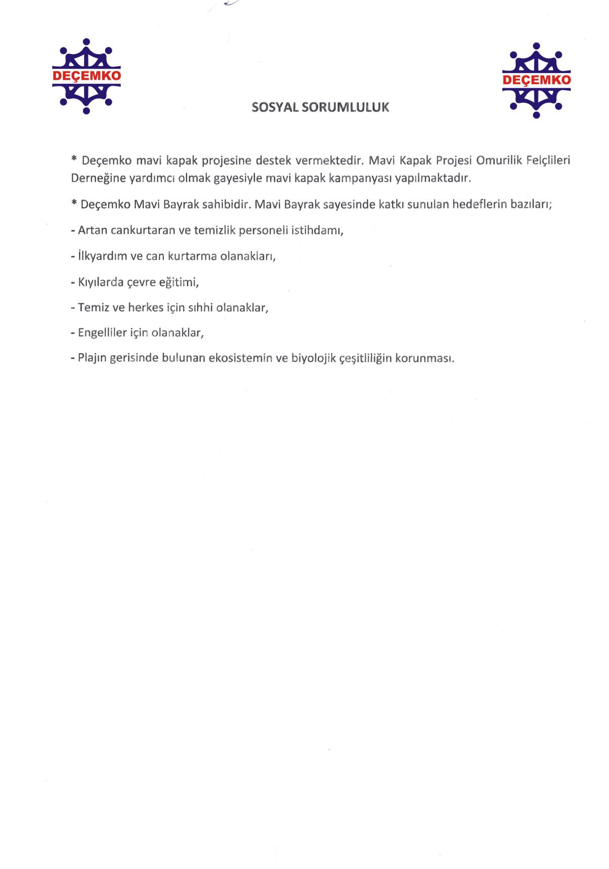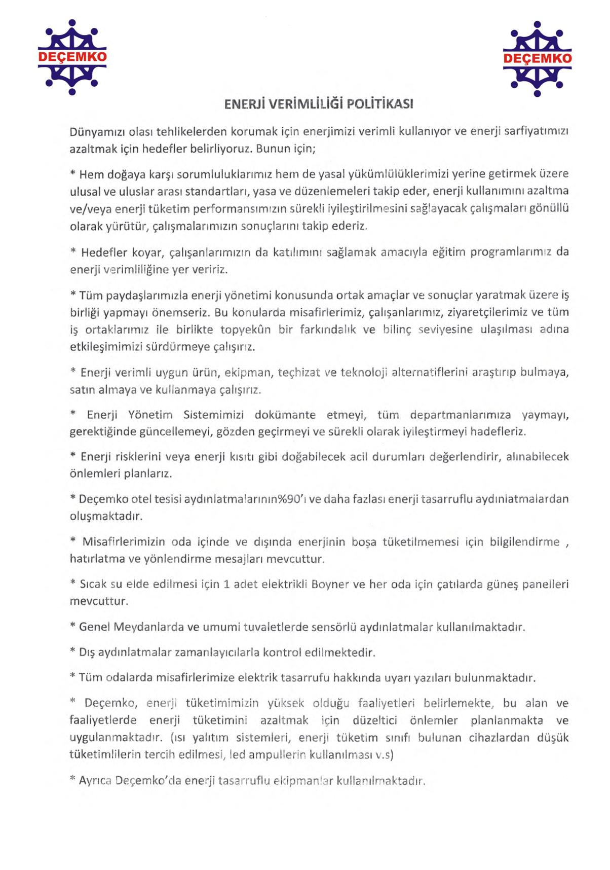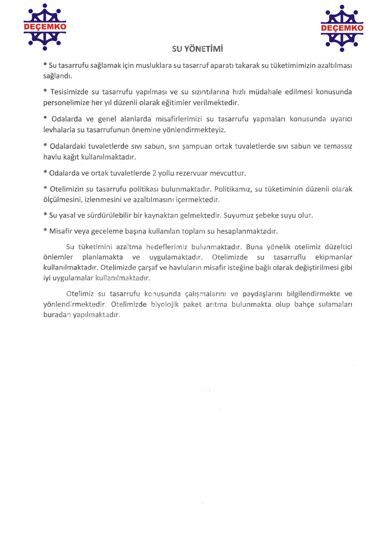 DEÇEMKO OTELİ Sürdürülebilir Turizm Politikası